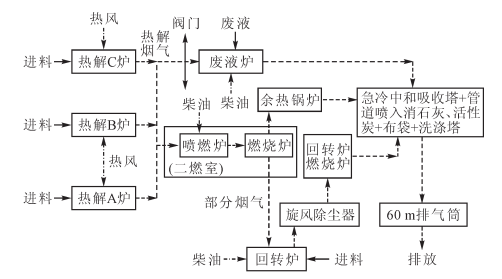 1、焚燒系統(tǒng)處置流程。熱解氣化燃燒系統(tǒng)主要即一燃室熱解氣化爐和二燃室燃燒爐組成,采用柴油作為助燃劑。熱解氣化爐(A、B、C 爐)交替循環(huán)使用,其中熱解氣化爐(C 爐)與廢液爐并聯(lián)(C 爐產(chǎn)生的高溫煙氣替代一次能源用于廢液爐的廢液加溫燃燒)。回轉(zhuǎn)爐焚燒系統(tǒng)燃燒煙氣首先通過旋風除塵器進行初級除塵,后引入回轉(zhuǎn)爐燃燒爐二燃室中進一步燃燒,產(chǎn)生的煙氣進入焚燒廢氣處理系統(tǒng)?;剞D(zhuǎn)爐采用柴油助燃,并引入熱解氣化爐二燃室部分煙氣作為燃燒熱源?;剞D(zhuǎn)爐二燃室設(shè)計溫度控制在 1100 ℃,煙氣停留時間為 2s 以上。廢液由廢液噴頭噴入廢液爐內(nèi)進行霧化燃燒,燃燒燃氣經(jīng)余熱爐換熱回收熱水后進入焚燒廢氣處理系統(tǒng)。廢液爐采用柴油作為輔助燃料,并配置串聯(lián)熱解爐(C 爐)產(chǎn)生高溫煙氣替代一次能源。廢液爐設(shè)計溫度控制在 1100 ℃,煙氣停留時間為 2s 以上。