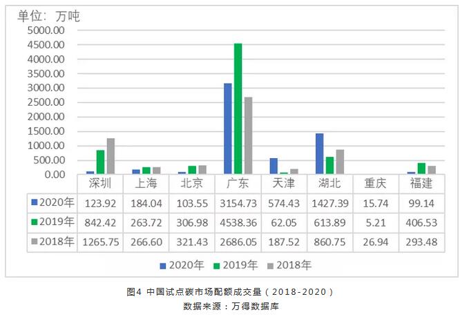 2020年中國試點碳市場交易量受疫情影響有所下滑,但由于交易價格的上升導致交易額與2019年基本持平。廣東碳市場繼續(xù)領跑試點碳市場交易量及交易額,試點交易規(guī)模差距仍存,交易價格進一步拉開差距。各試點在體系設定和交易運行層面積累經驗,通過實踐比較驗證不同政策的適用性,為全國碳市場建設提供經驗和基礎。