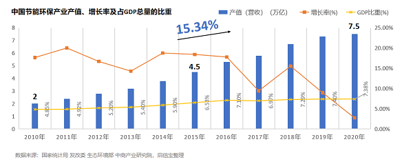 報告顯示:“十三五”期間,我國資源節(jié)約和環(huán)境保護工作成效顯著,綠色產業(yè)發(fā)展勢頭良好,我國節(jié)能環(huán)保產業(yè)快速發(fā)展。我國節(jié)能環(huán)保產業(yè)產值由2015年的4.5萬億元上升到2020年的7.5萬億元左右,年均增速15%。