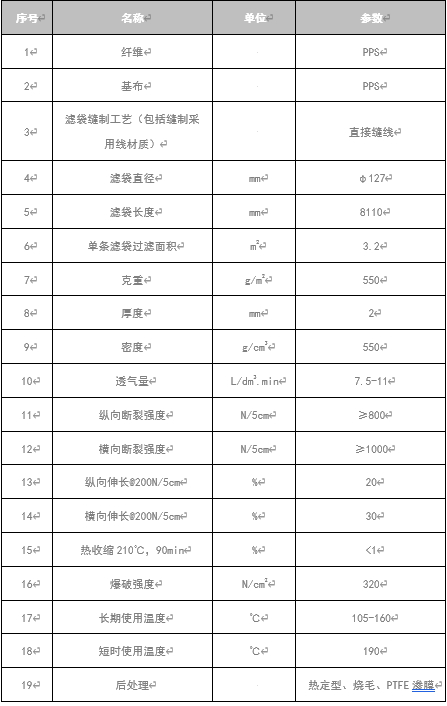 首先來了解一下除塵布袋的各項(xiàng)性能參數(shù),主要包括:濾袋直徑、長度、單條濾袋濾料面積、克重、厚度、透氣量等。詳見下表