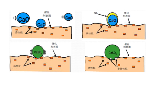 飛灰中的游離CaO和催化劑表面吸附的SO3反應(yīng)生成CaSO4,CaSO4在催化劑表面結(jié)垢,阻止了反應(yīng)物質(zhì)向催化劑表面的擴(kuò)散和向催化劑內(nèi)部擴(kuò)散。
